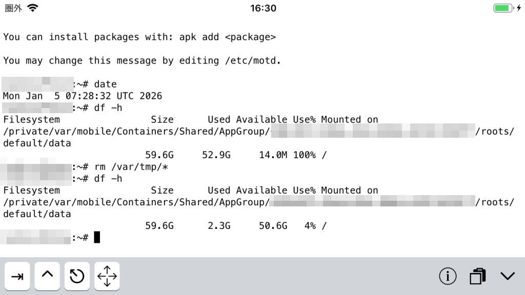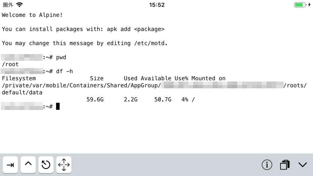 「iSH」を動かして「df -h」で、